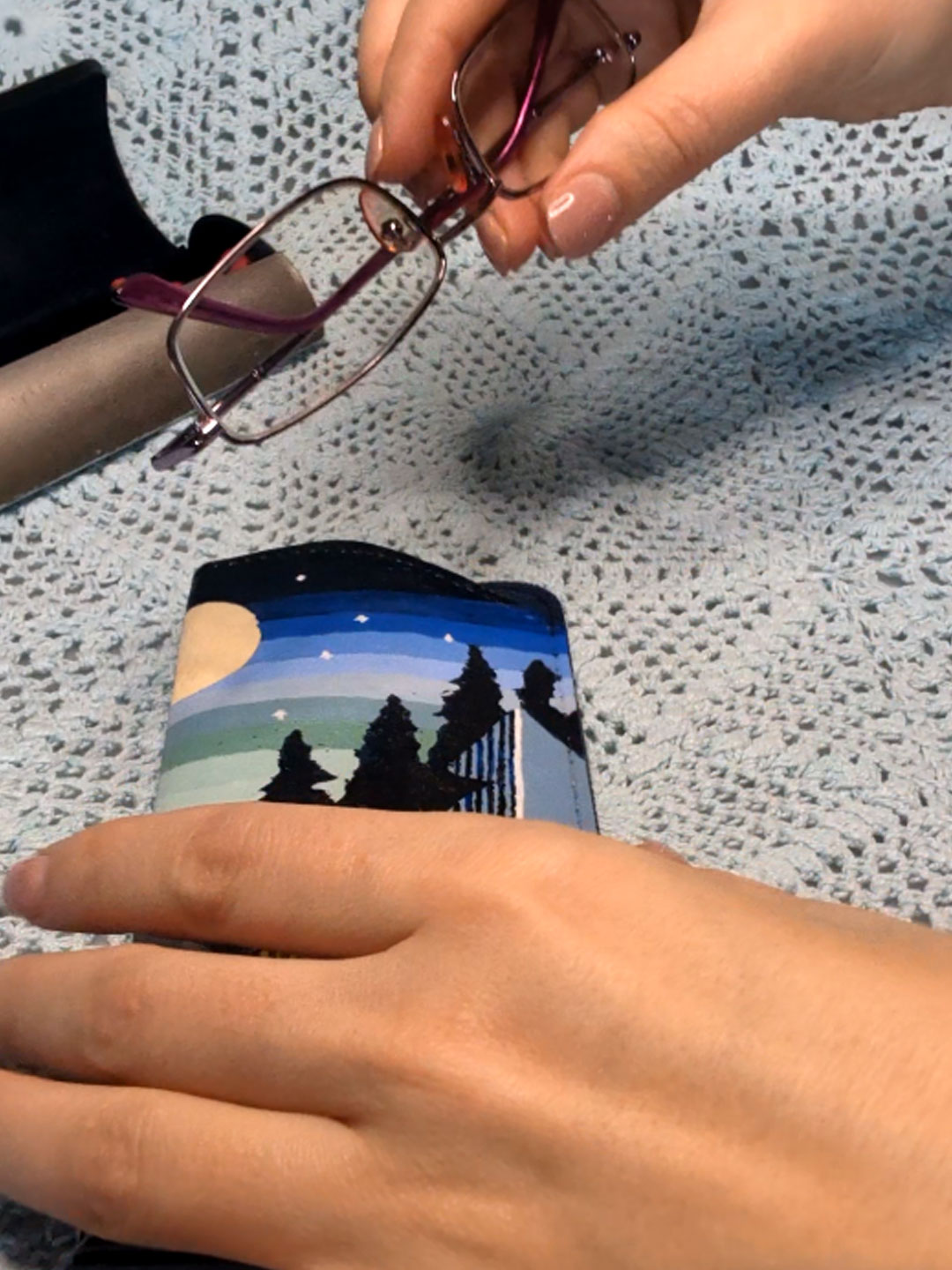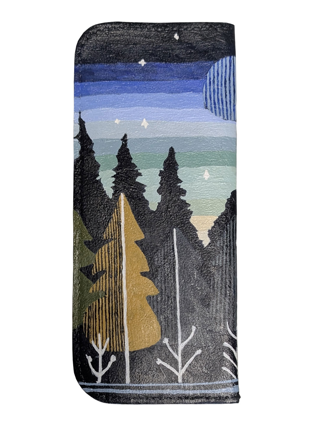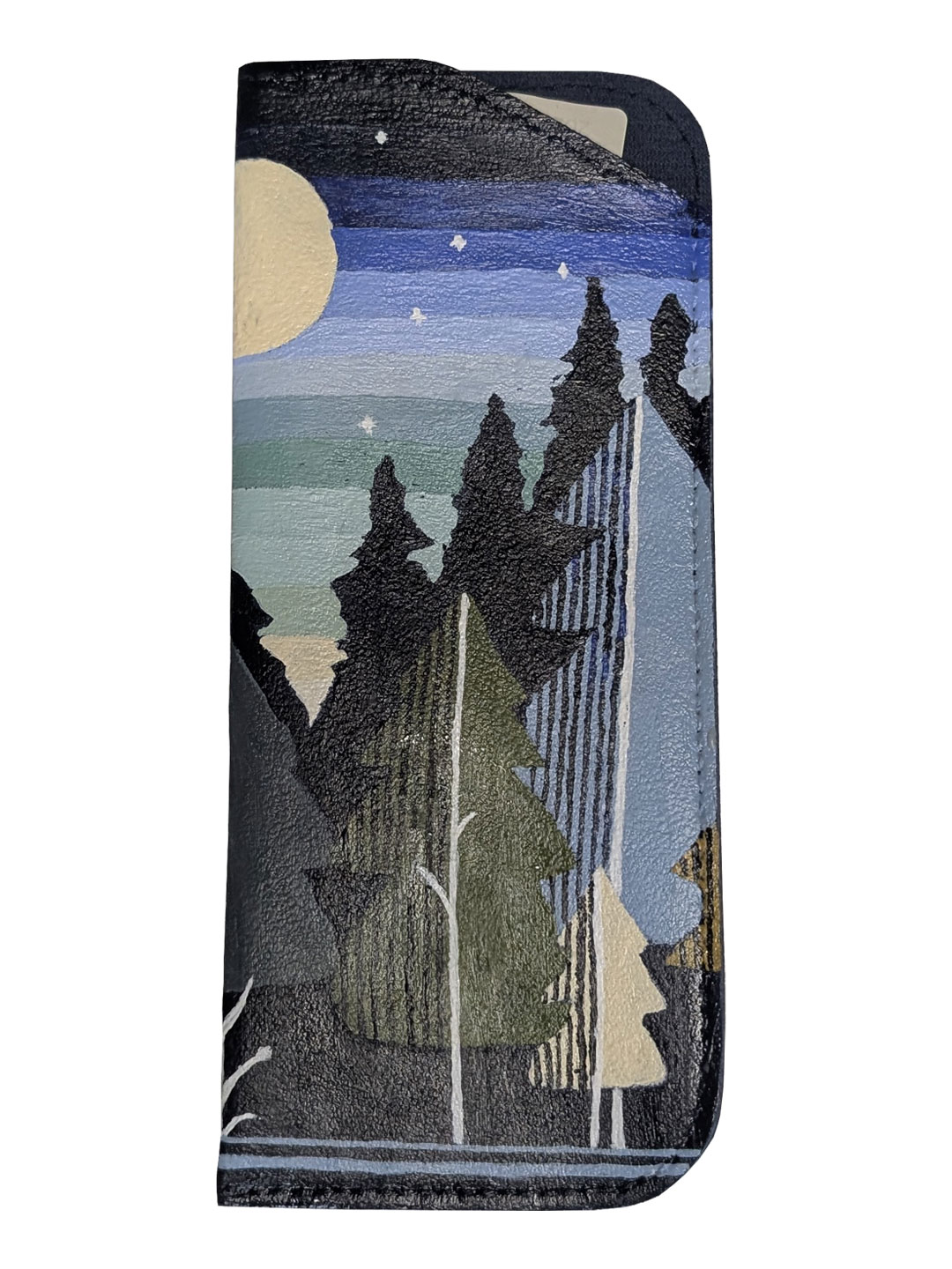 Розфарбований вручну шкіряний чохол в одному екземплярі. На темно-синьому фоні контрастні дерева та повний місяць.