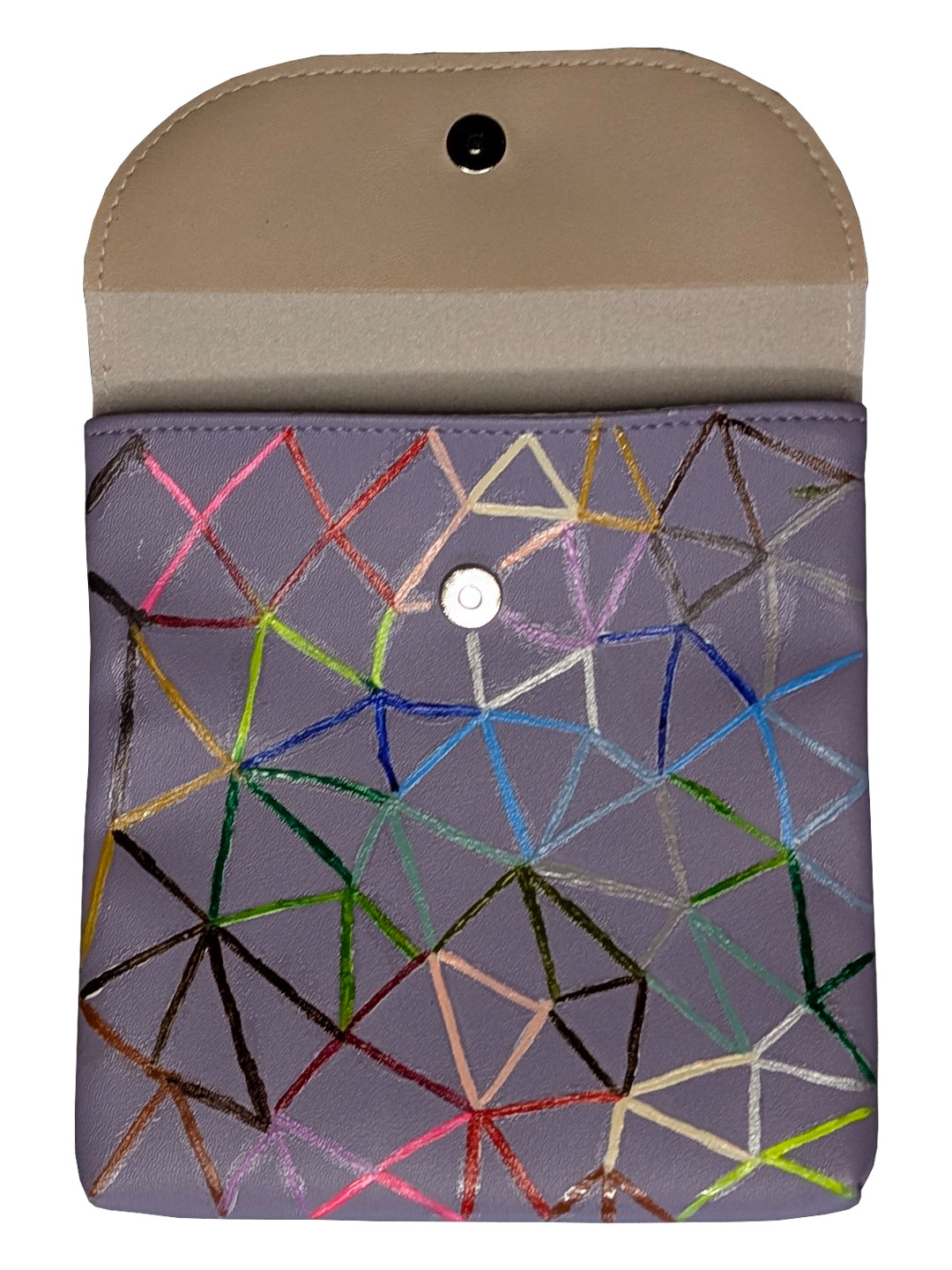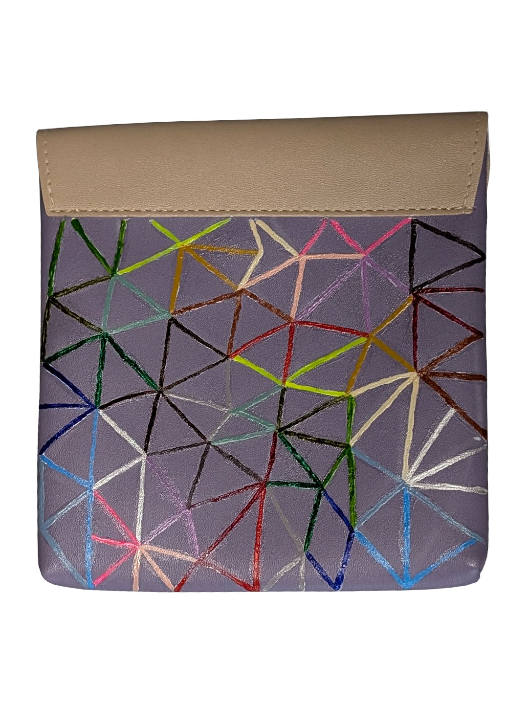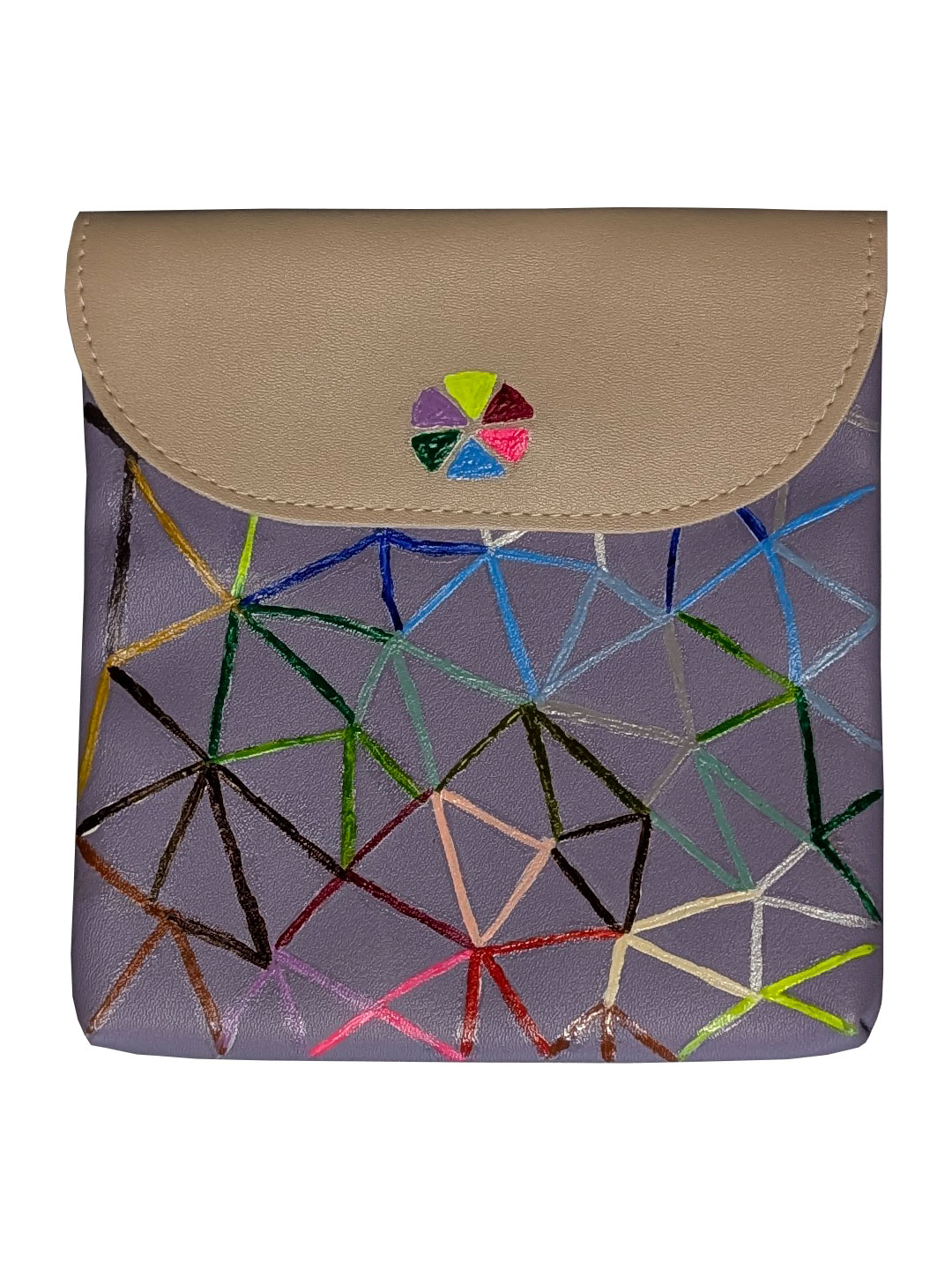 Маленька міні-сумочка для гігієнічних засобів, ліків, усілякіх дрібничок красивого бузкового кольору, розмальована акрилом вручну в шалену веселкову геометрію. В одному екземплярі.