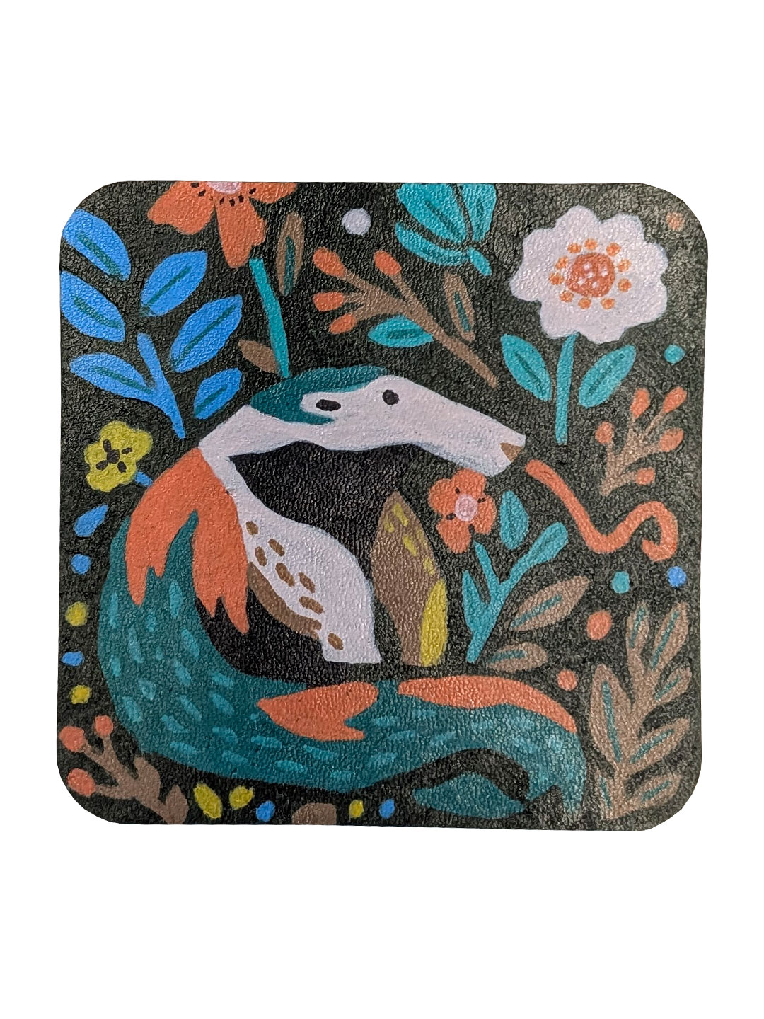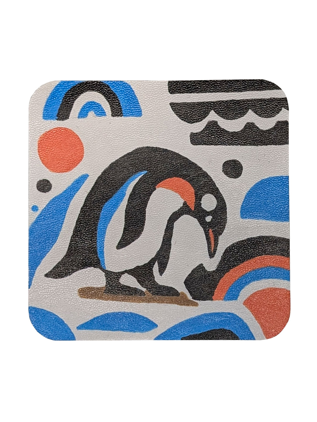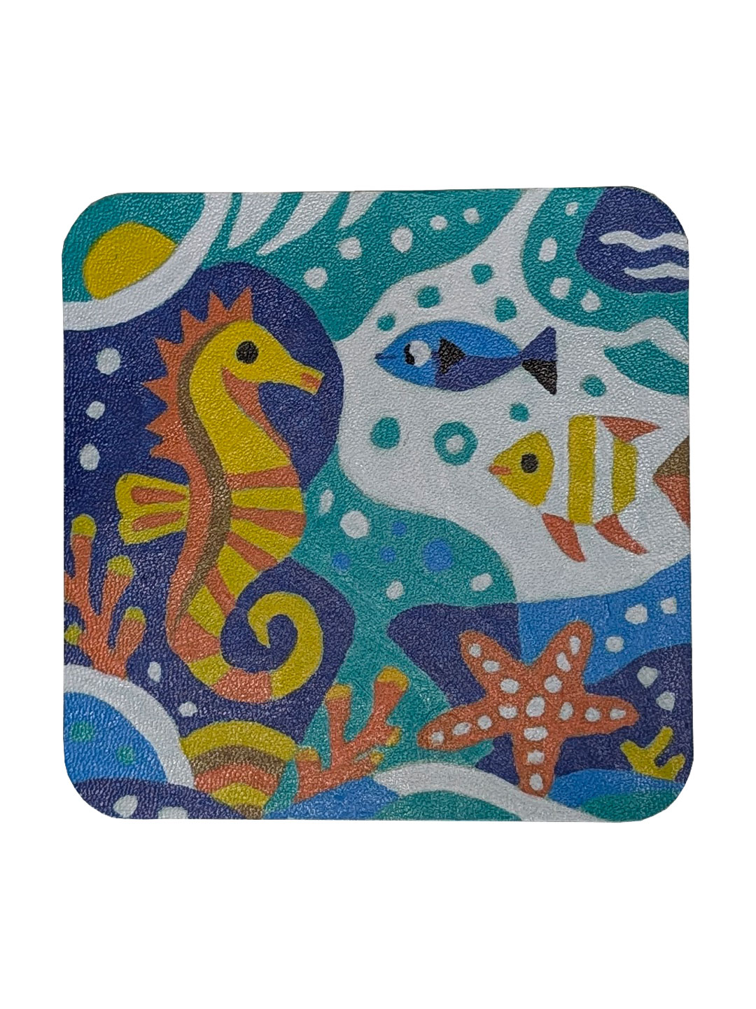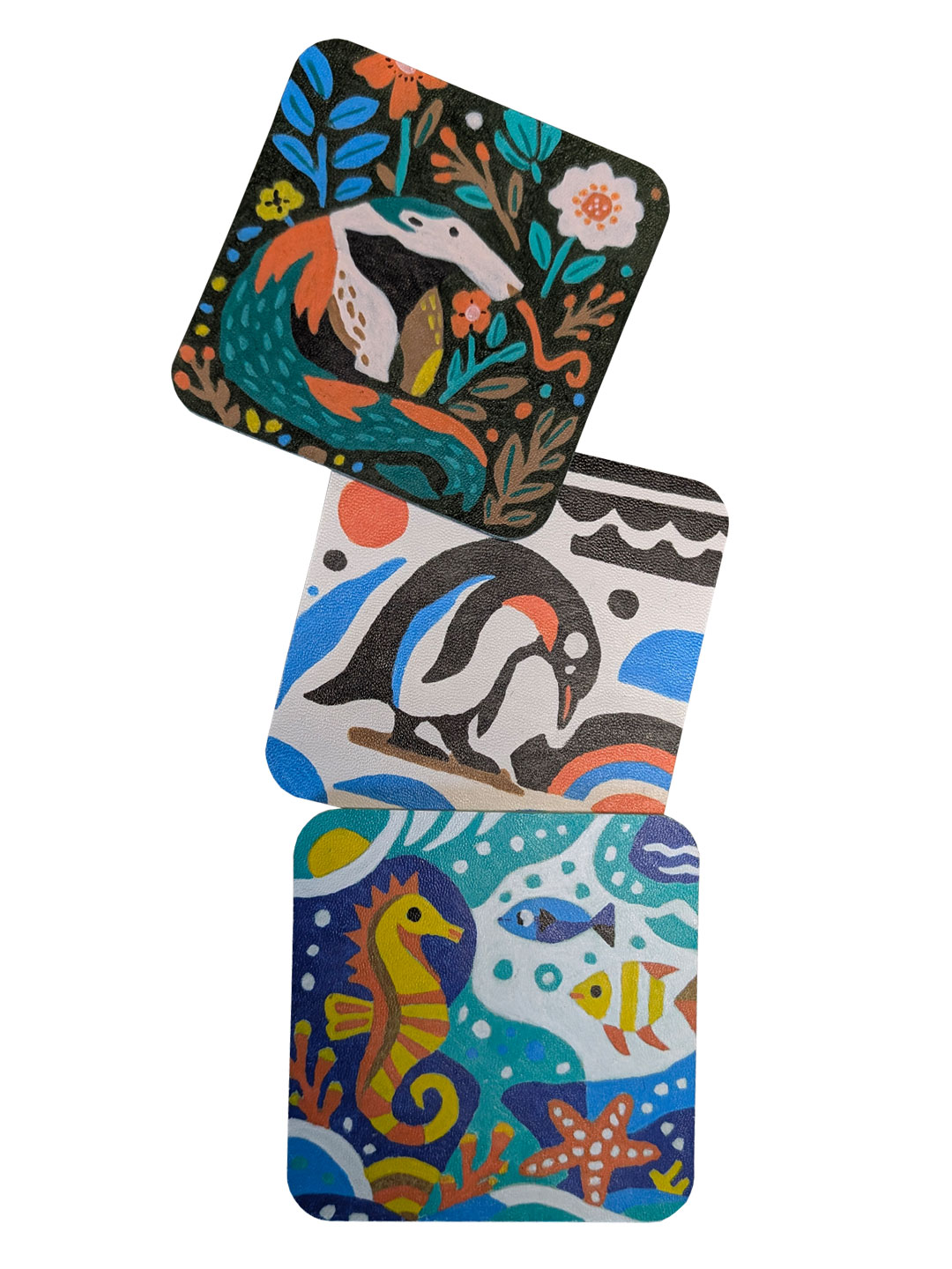Яскраві підставки квадратної форми з закругленими куточками. Розмальований вручну набір з трьох штук - пінгвін, мурахоїд та морський коник.